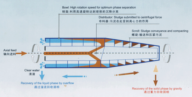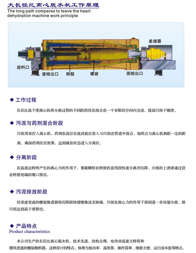 污泥離心脫水處理成套裝置(臥螺離心機),全稱:臥式螺旋卸料沉降離心機,是城市生活污水處理、自來水生產(chǎn)過程中的污泥處理、工農(nóng)業(yè)污水處理工程中的重要設備。