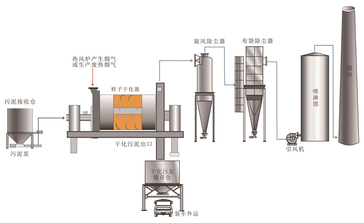 4.熱風(fēng)爐產(chǎn)生的煙氣(或生產(chǎn)廢熱煙氣)經(jīng)調(diào)溫后進入轉(zhuǎn)子干化器,對污泥進行加熱干化。